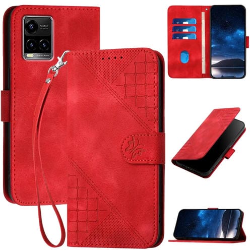 Para Vivo Y21S / Y21T Yx0080 Funda para Teléfono de Cuero con Tapa y Patrón En Relieve de Mariposa En Cuadrícula con Cordón (Rojo)