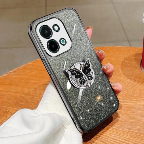 Para Vivo Y28 4G Estuche para Teléfono de TPU con Soporte de Mariposa con Brillo Degradado Plateado (Negro)