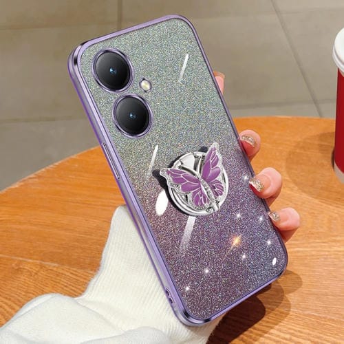 Para Vivo Y35 + Funda para Teléfono de TPU con Soporte de Mariposa con Brillo Degradado Plateado (Púrpura)