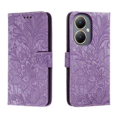 Para Vivo Y35M + Funda para Teléfono de Cuero con Tapa y Estampado de Flores de Encaje (Púrpura)