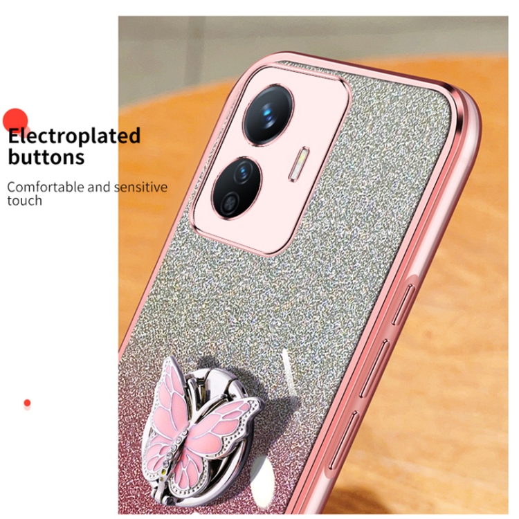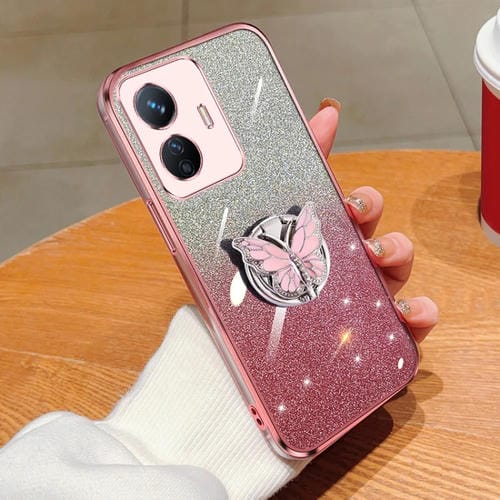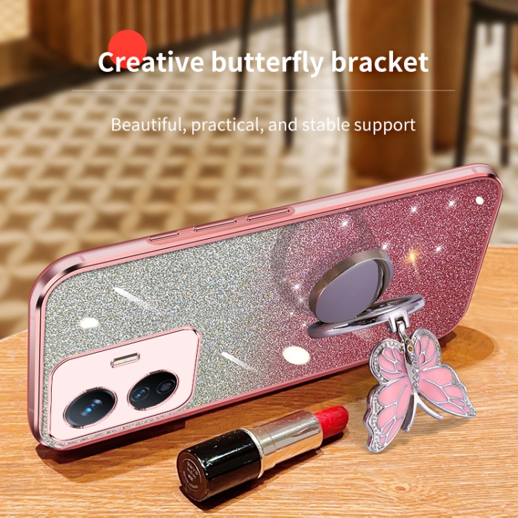 Para Vivo Y77E Funda para Teléfono de TPU con Soporte de Mariposa con Brillo Degradado Plateado (Rosa)