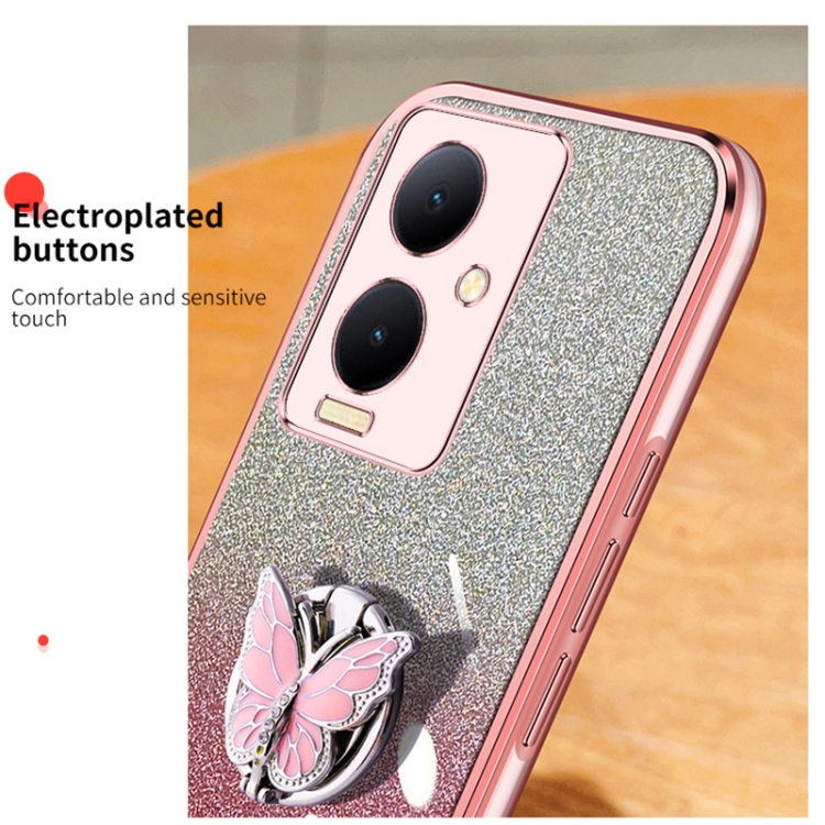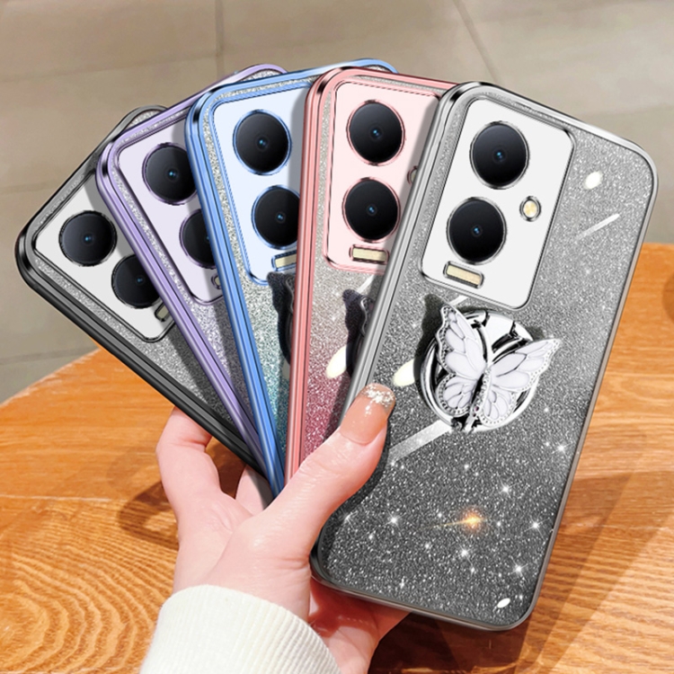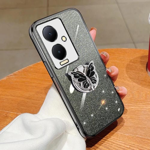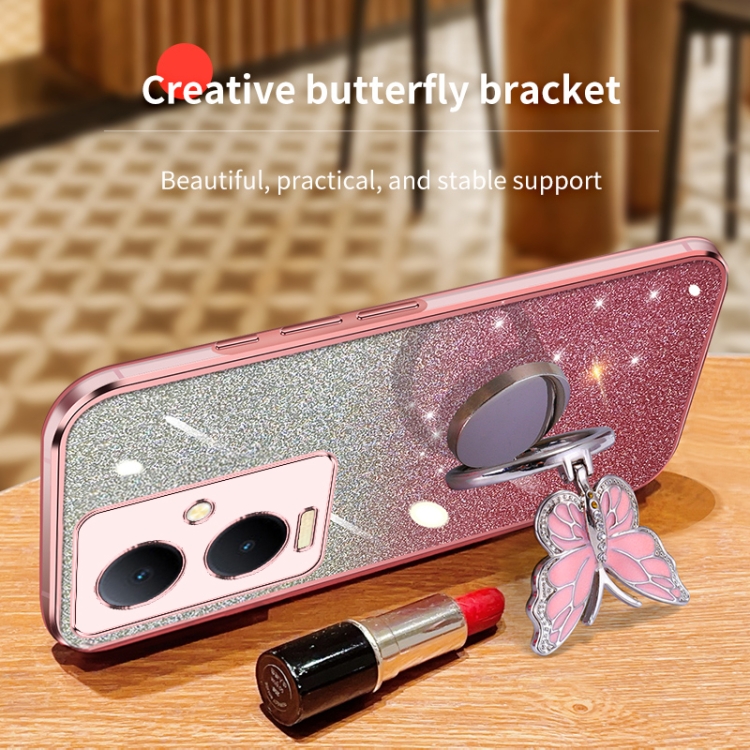 Para Vivo Y78 + Funda para Teléfono de TPU con Soporte de Mariposa con Brillo Degradado Plateado (Negro)