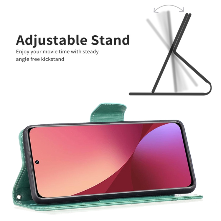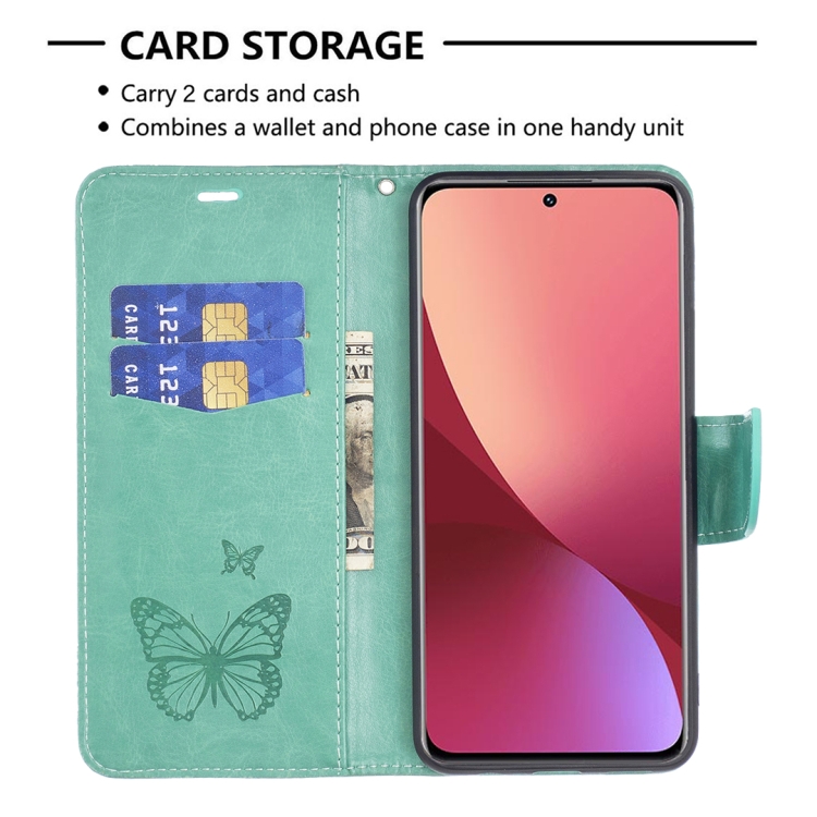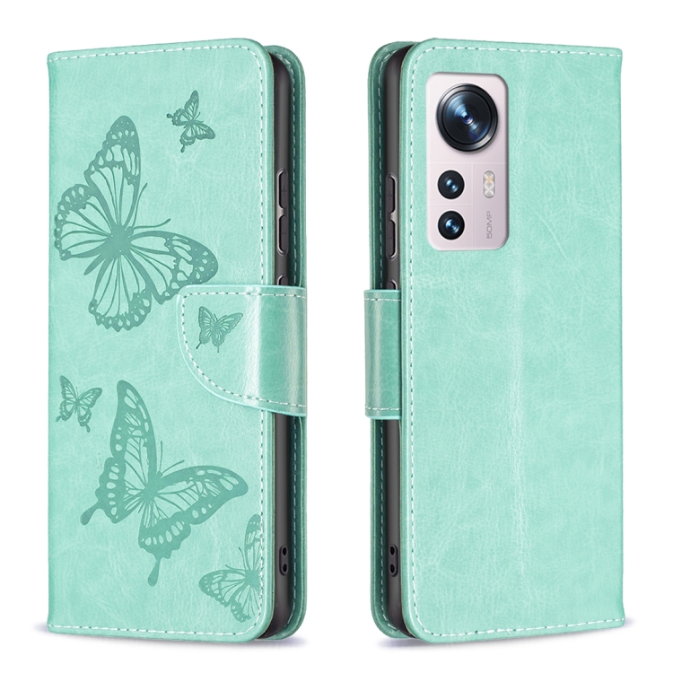 Para Xiaomi 12 Dos Estuche de Cuero En Relieve de Mariposas (Verde)