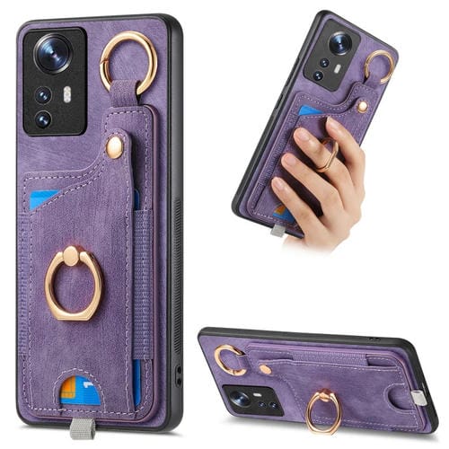 Para Xiaomi 12 Pro Funda para Teléfono con Bolsa para Tarjeta con Anillo y Sensación de Piel Retro con Lazo para Colgar (Púrpura)