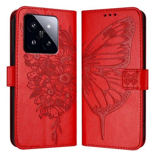 Para Xiaomi 14 Pro 5G Funda De Teléfono De Cuero Con Mariposa En Relieve Global (Rojo)