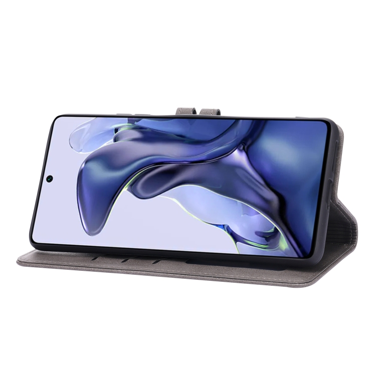 Para Xiaomi Mi 11T Estampado de Gato Feliz En Relieve, Caja de Cuero Horizontal con Soporte y Ranuras para Tarjetas y Billetera (Gris)