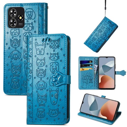 Funda para ZTE Blade A73 4G de Cuero con Relieve de Perro y Gato (Azul)