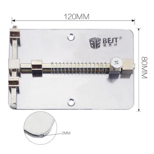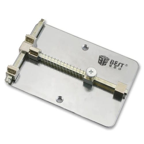 La herramienta de reparación BEST-001 está diseñada específicamente para la manipulación y Soporte de Placas de circuito de acero inoxidable, compatible con dispositivos Acer. Este accesorio profesional facilita la reparación de Placas Base en Teléfonos celulares, proporcionando un Soporte seguro y estable durante el proceso de mantenimiento o sustitución de componentes electrónicos. Su construcción en Metal garantiza durabilidad y resistencia, mientras que sus clips regulables y tornillo de fijación permiten un ajuste preciso para diferentes tamaños de Placas. Además, la almohadilla suave antideslizante protege las Placas durante la reparación evitando desplazamientos o daños.