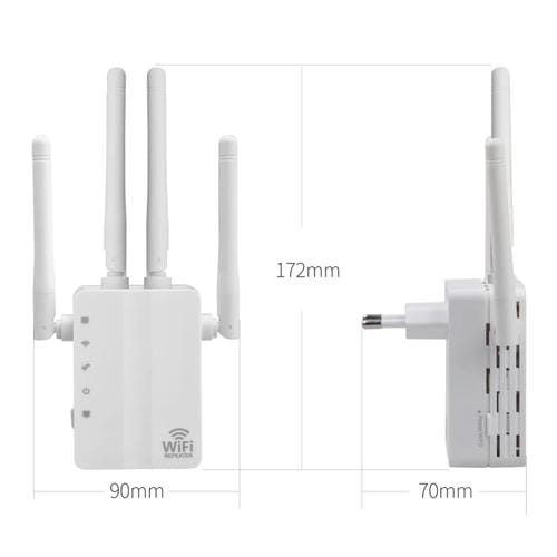 El repetidor WiFi extensor de rango 5G/2,4G ofrece una solución eficiente para ampliar la cobertura de red Inalámbrica en entornos domésticos o de oficina. Con una velocidad de transmisión de hasta 1200Mbps, este dispositivo es compatible con redes WiFi de doble Banda (5 GHz y 2,4 GHz), permitiendo mejorar la Señal en zonas con cobertura limitada. Equipa cuatro Antenas externas que garantizan una Señal estable y potente. Además, dispone de dos Puertos Ethernet RJ45 para conexiones Cableadas, aumentando la versatilidad de su uso. Su diseño incluye un enchufe europeo y un Botón de cifrado WPS que facilita la configuración segura con un solo clic. Este repetidor puede operar en dos modos: relé (retransmisión) y punto de acceso (AP), adaptándose a diferentes necesidades de ampliación de red y cobertura.