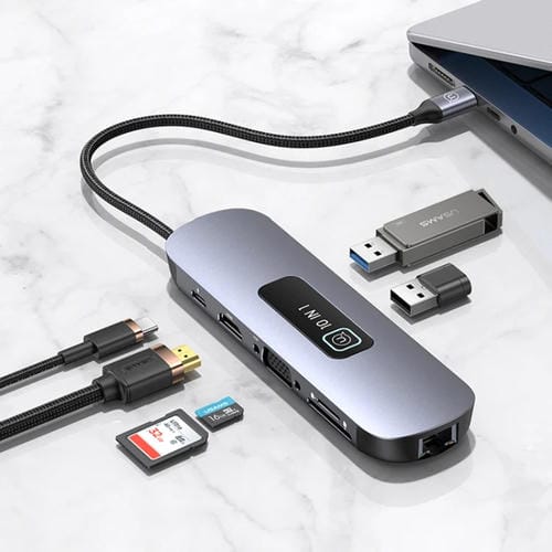 • 10 interfaces: 3x USB 3.0, ranura para Tarjeta SD, ranura para Tarjeta TF, 1x USB Tipo C con PD3.0 (100W), HDMI (3840x2160P/30Hz), VGA (1080P/60Hz), RJ45 Gigabit Ethernet; velocidad de transferencia de datos hasta 5 Gbps; tamaño compacto de 123x43x17mm; peso aproximado de 80g; Cable de Conexión de 15 cm