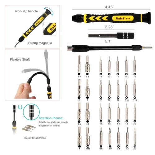 - Herramientas con puntas magnéticas y mangos antideslizantes que mejoran la precisión y el control durante la reparación