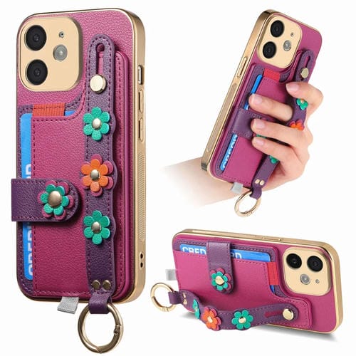 Funda para Teléfono iPhone 11 con Bolsa para Tarjeta y Pulsera con Flores Estereoscópicas (Púrpura)
