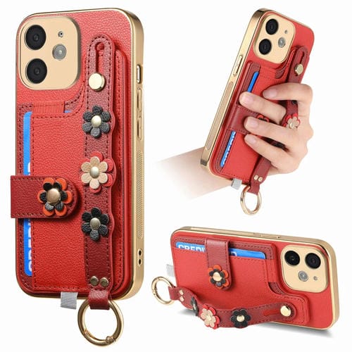 Funda para Teléfono iPhone 11 con Bolsa para Tarjeta y Pulsera con Flores Estereoscópicas (Rojo)