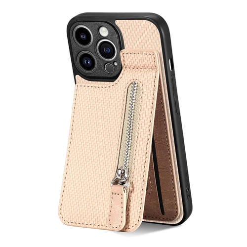 Funda para iPhone 13 Pro Carbon Fiber Horizontal Flip Zipper Wallet (Khaki)