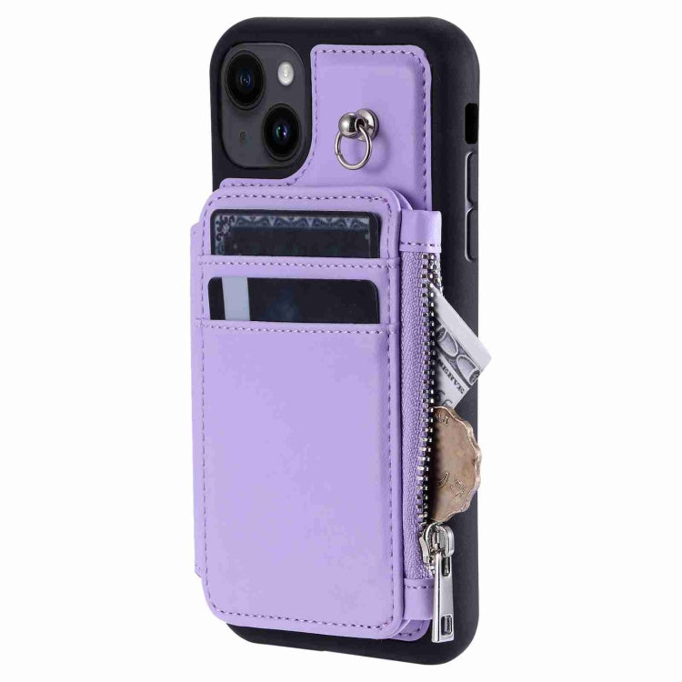 Estuche para teléfono iPhone 15 Plus con RFID ranuras para tarjetas cremallera (Púrpura)