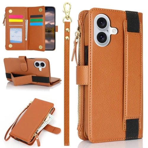 Funda de Cuero Rfid para iPhone 16 con Cierre de Cremallera y Correa para la Muñeca (Marrón)
