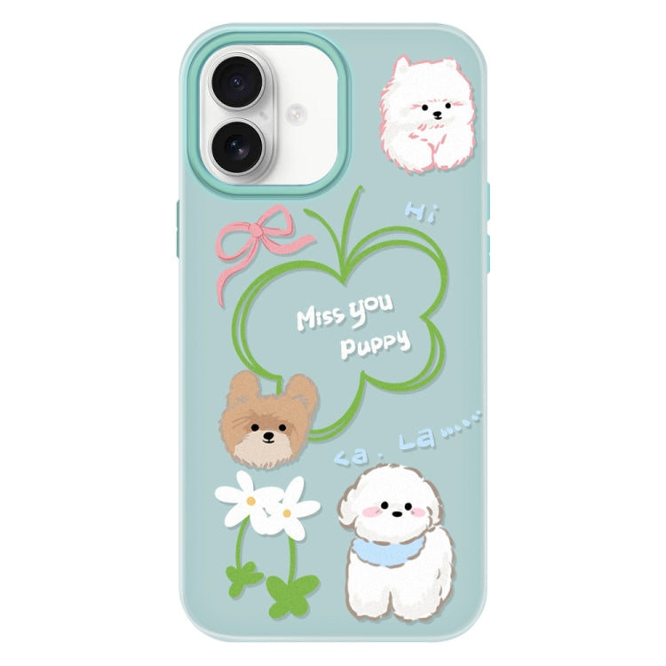 Funda híbrida TPU y Policarbonato iPhone 16 Plus protección Flores Cachorros (Verde Claro)