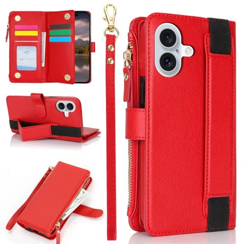Funda de Cuero Rfid para iPhone 16 Plus con Cierre de Cremallera y Correa para la Muñeca (Rojo)