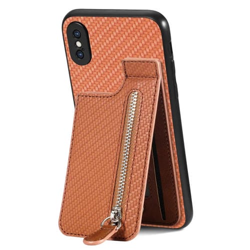Funda de teléfono iPhone Xs Max con cremallera vertical de fibra de carbono (Marrón)
