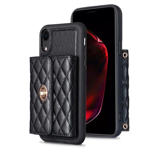 Funda de teléfono iPhone Xr Rómbica billetera cuero hebilla metal vertical (Negro)