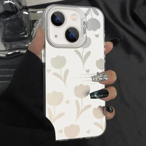 Funda híbrida para iPhone 13 TPU y PC con pintura plateada (Tulipanes huecos negros)