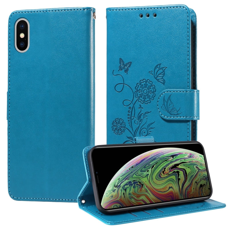 Funda de Cuero iPhone X/Xs Diseño Mariposas y Flores En Relieve (Azul)