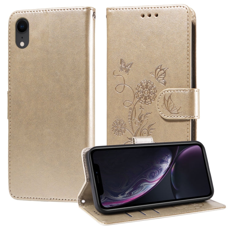 Funda de Cuero iPhone Xr Diseño Mariposas y Flores En Relieve (Dorada)