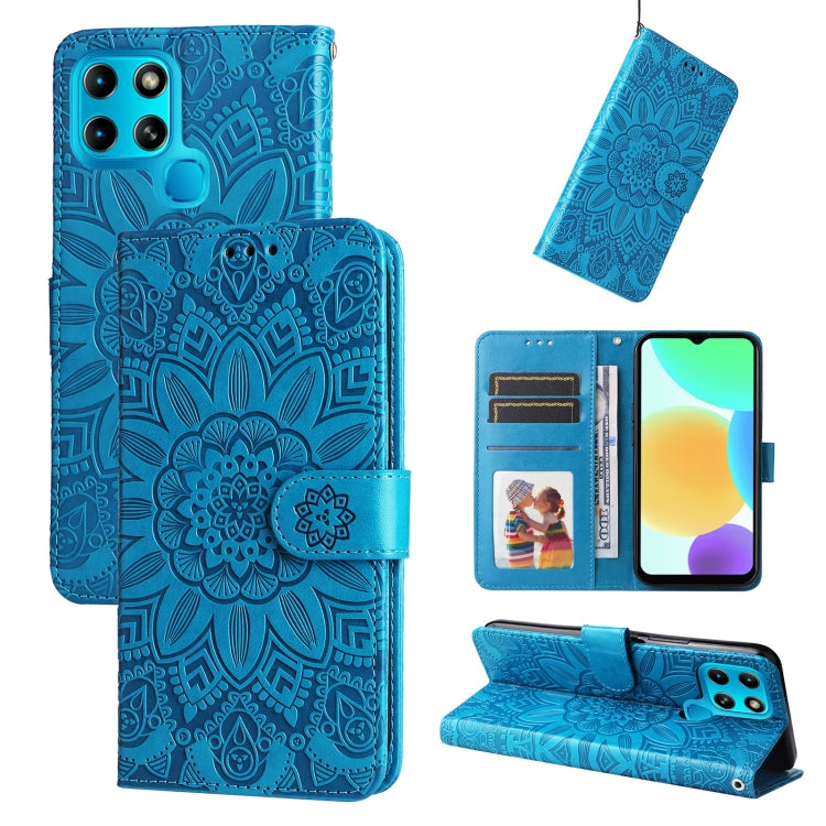 Estuche para Teléfono Infinix Hot 12 Cuero con Estampado de Girasol en Relieve (Azul)