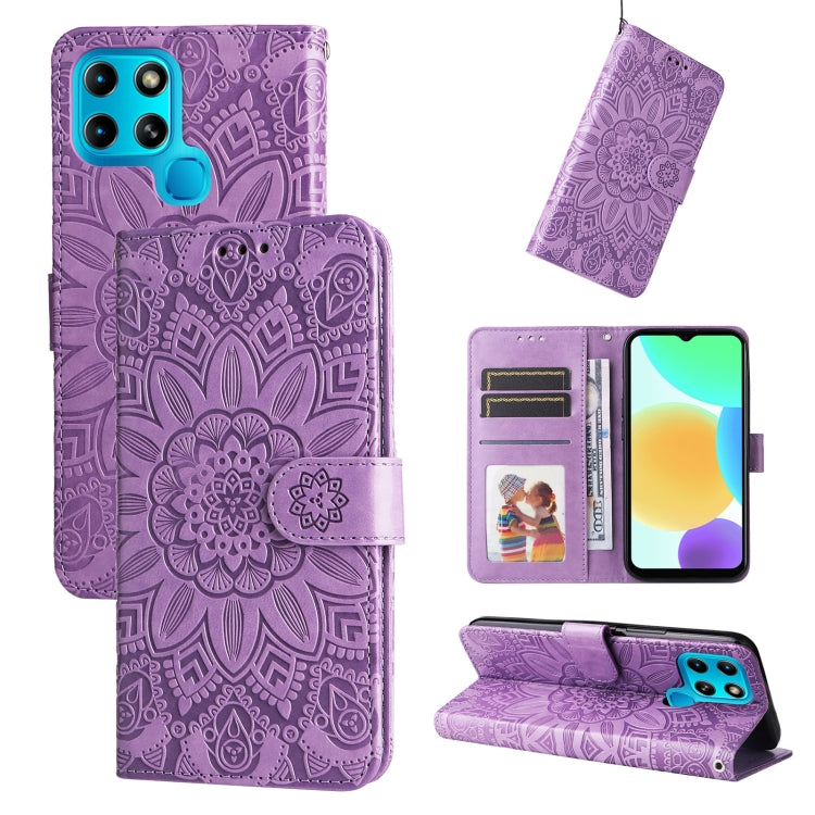 Estuche para Teléfono Infinix Hot 12 Cuero con Estampado de Girasol en Relieve (Púrpura)