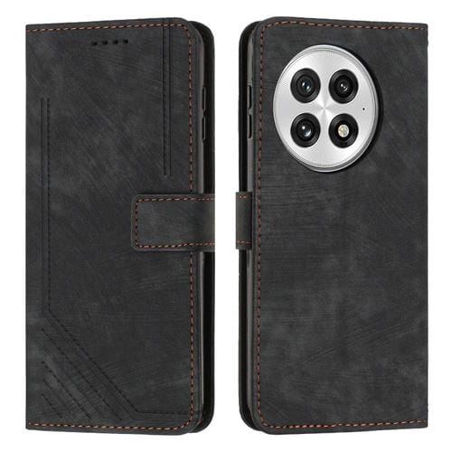 Funda de Cuero con Patrón de Rayas y Tacto de Piel para OnePlus 13 con Cordón (Negro)