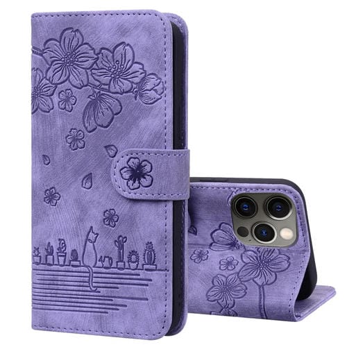 Estuche para iPhone 13 Pro Cartoon Sakura Cat Cuero En Relieve (Púrpura)