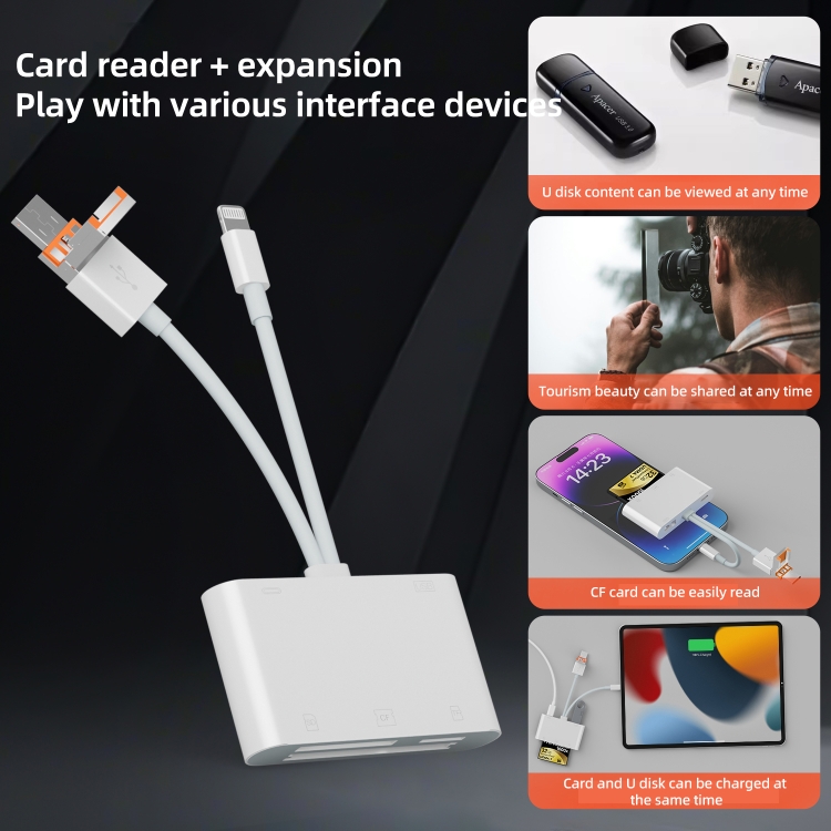 El adaptador de lector de tarjetas USB-A/8 pines/Tipo C es un accesorio multifuncional desarrollado especialmente para solucionar el problema de que es demasiado complicado importar fotos desde cámaras digitales a dispositivos.Al utilizar la interfaz Tipo C, la interfaz USB y la ranura para tarjetas CF/TF/SD del adaptador, la cámara digital puede importar fotos directamente al dispositivo mediante un cable de datos y un convertidor.También se puede utilizar para ampliar la unidad flash USB con el menor consumo de energía.Al mismo tiempo, la interfaz Tipo C puede cargar dispositivos con interfaz de 8 pines e interfaz Tipo C.
