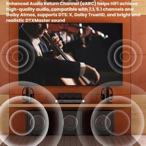 5. El canal de retorno de audio mejorado (eARC) ofrece sonido de alta fidelidad, compatible con canales 7.1, 5.1 y Dolby Atmos, compatible con DTS Master, DTS X y Dolby TrueHD, con un sonido nítido y auténtico.