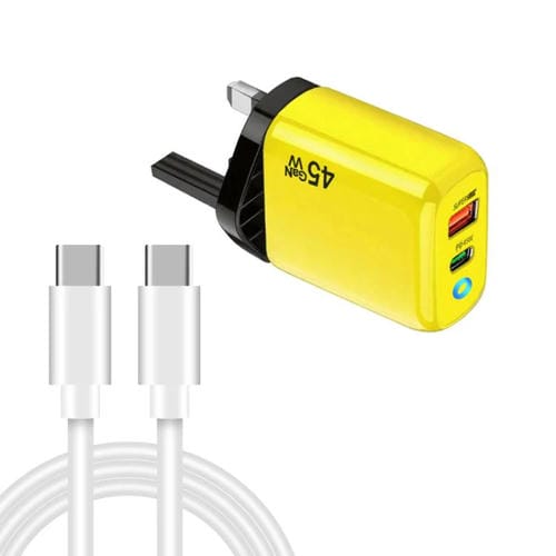 Cargador TE-PD45 GaN 45 W PD3.0/Tipo C + USB 3.0 con cable de datos tipo C a tipo C, enchufe británico (amarillo)