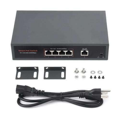 - 4 Puertos PoE RJ45 de 10/100/1000 Mbps con PoE+; 1 Puerto de enlace ascendente RJ45 de 10/100/1000 Mbps; potencia total de 120 W; potencia máxima por Puerto de 30 W; ancho de Banda de 12 Gbps; profundidad de tabla MAC de 2K; control de flujo full y half-duplex; entrada de Alimentación CA 110V-240V; salida CC 52 V ± 5 % 2,3 A