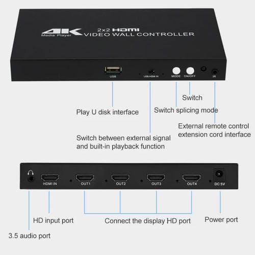 • Soporta múltiples modos de empalme: 1x1, 1x2, 1x3, 1x4, 2x2, 2x1, 3x1, 4x1; salida RGB444 de 24 bits; entrada USB para reproducción directa; salida de audio estéreo de 3,5 mm compatible con amplificadores externos; funcionamiento plug and play