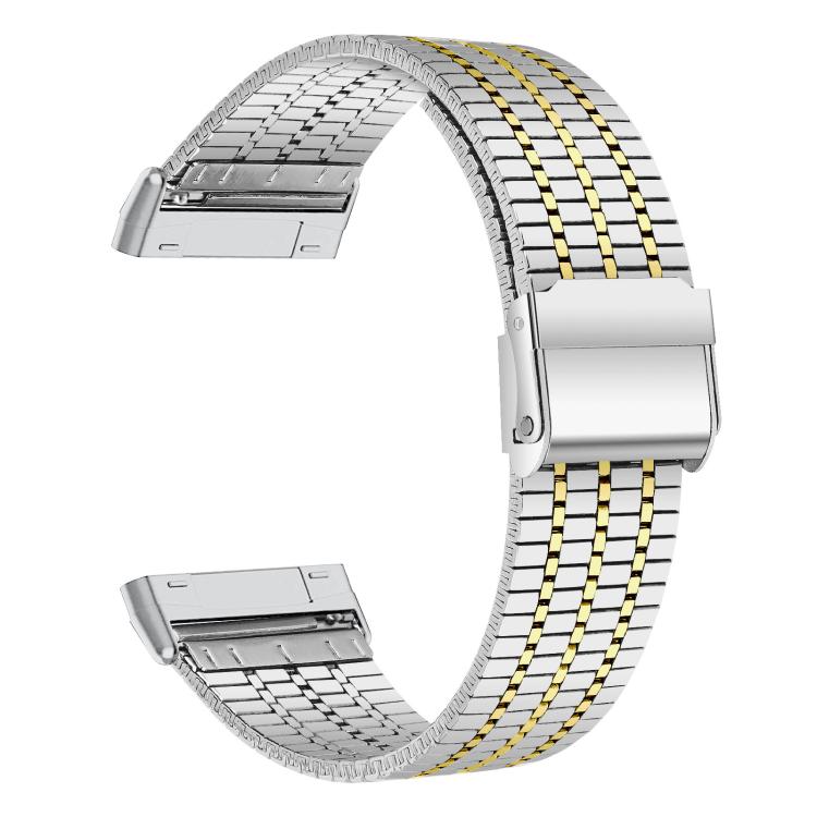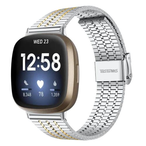 Correa de acero inoxidable con hebilla de siete cuentas para Fitbit Versa 4/3/Sense 2/Sense xDfind (plata y dorada)