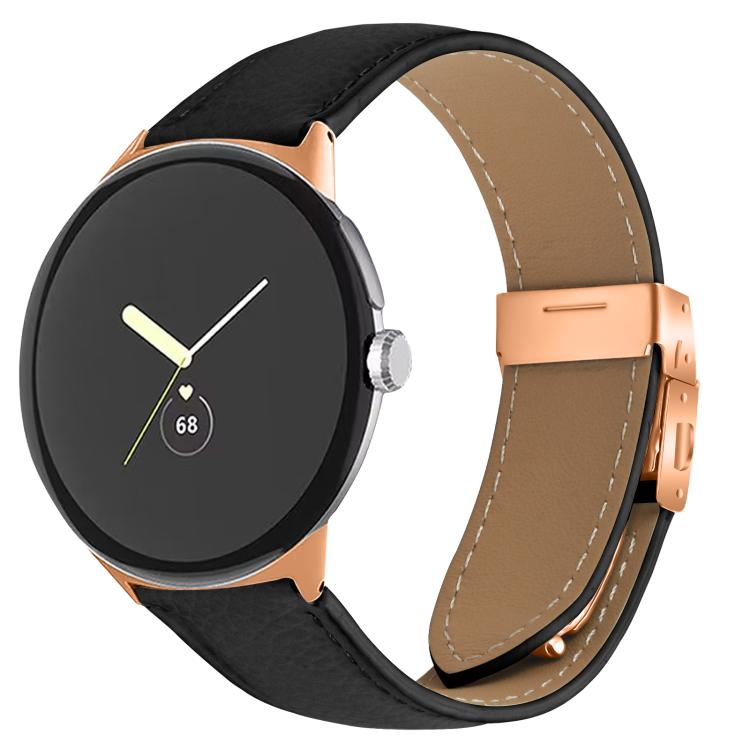 Correa de cuero con hebilla de caparazón de tortuga en oro rosa con textura de lichi de 41 mm para Google Pixel Watch 4 / 3 / 2 / 1 (negra)