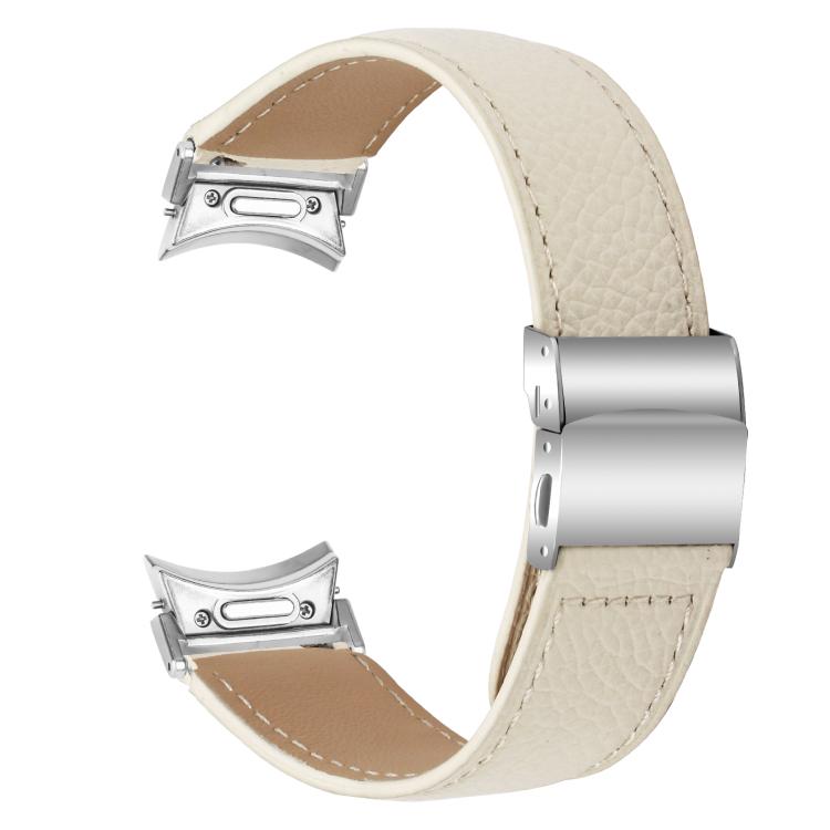 Correa de cuero con hebilla trasera de tortuga plateada y textura de lichi de liberación rápida para Samsung Galaxy Watch 7 de 40/44 mm (blanco cremoso)