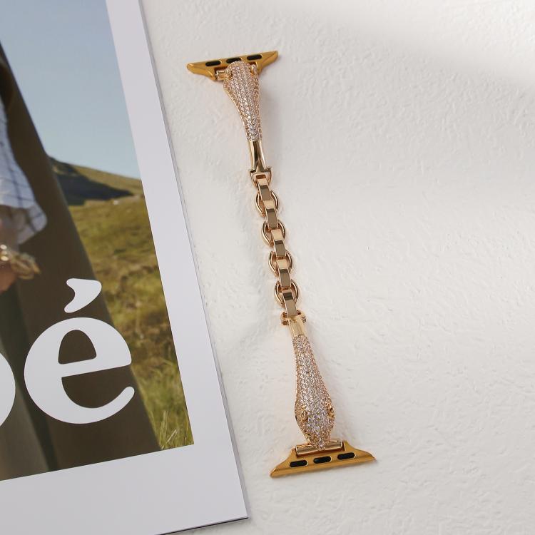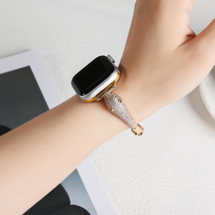 Correa de reloj con cabeza de leopardo y circonita incrustada de cobre para Apple Watch de 42 mm, 41 mm, 40 mm y 38 mm (dorada)