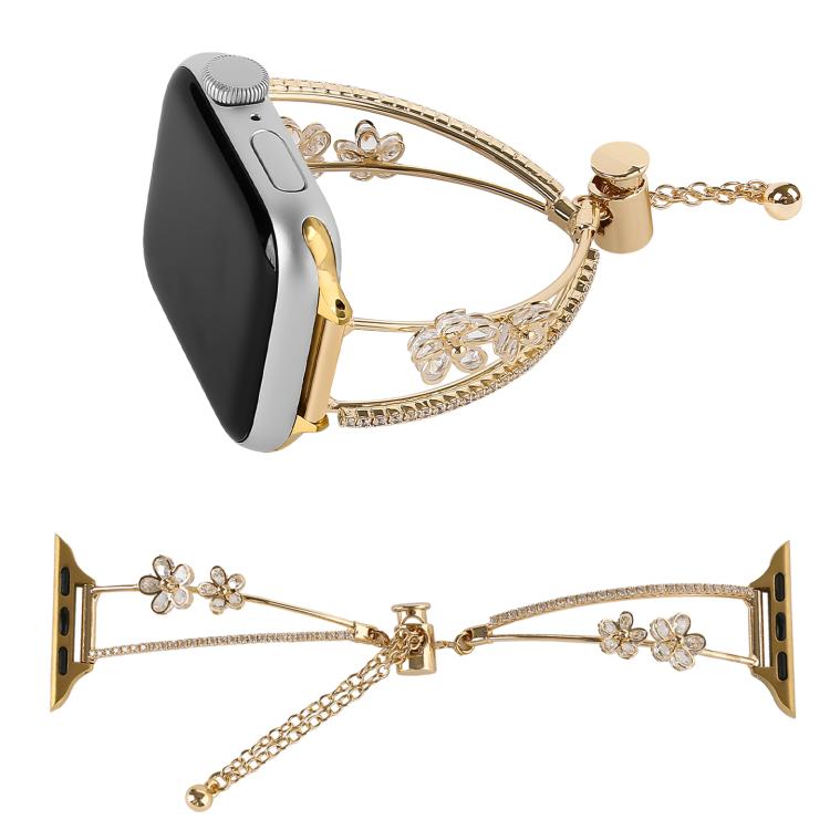 Correa de reloj con flor de cinco pétalos y circonitas incrustadas de cobre para Apple Watch de 42 mm, 41 mm, 40 mm y 38 mm (plateada)
