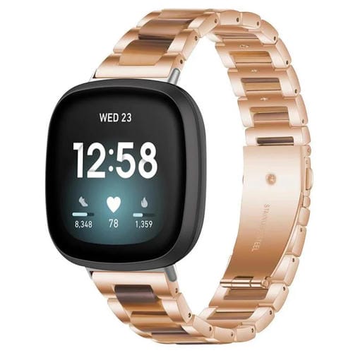 Correa de resina metálica con tres cuentas para Fitbit Versa 4/3/Sense 2/Sense xDfind (oro rosa y marrón)