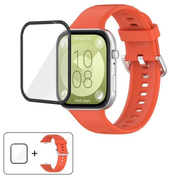 Correa de silicona con hebilla de acero plateada y película curva 3D para Huawei Watch Fit 4 (naranja)
