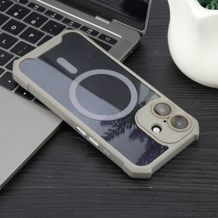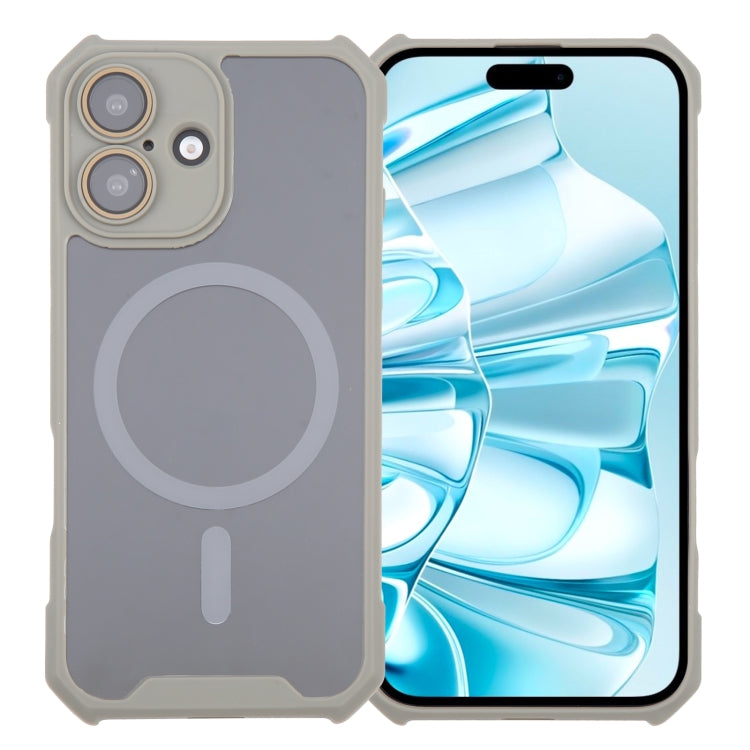 Estuche acrílico y TPU con bocina magnética Magsafe para iPhone 16 con Película de Lente de dos colores (Gris)