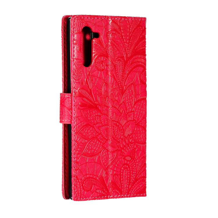 Estuche de Cuero Galaxy Note10 Tapa Horizontal Soporte Ranuras Tarjetas Billetera Marco Fotos Cordón (Rojo)