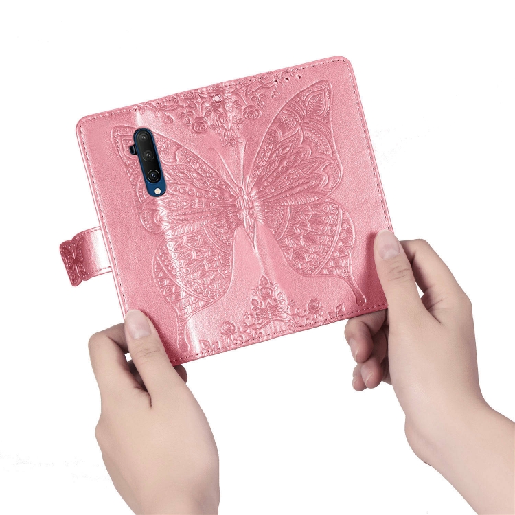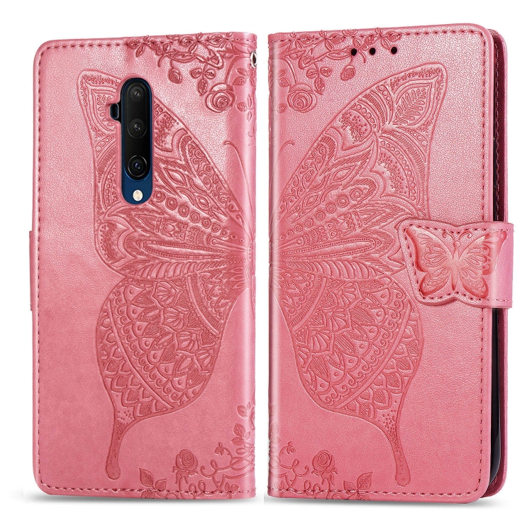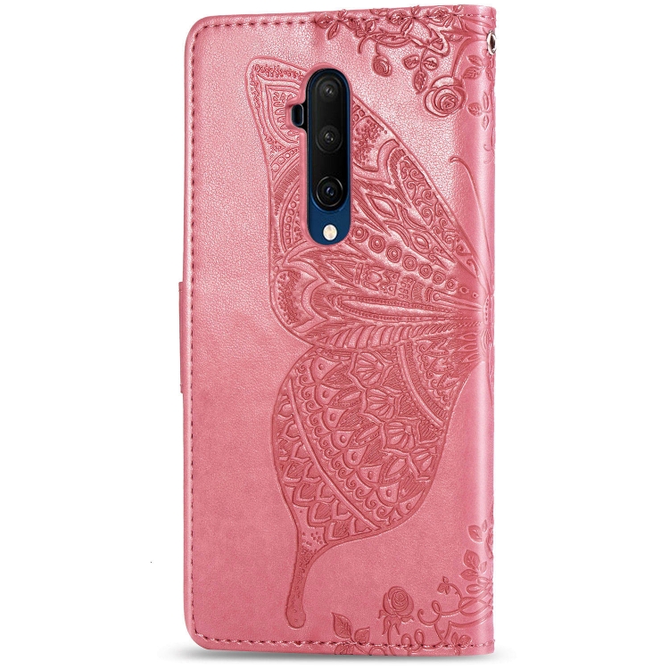 Estuche de Cuero For One Plus 7T Pro Butterfly Love Flower Abatible Horizontal con Soporte y Cordón (Rosa)