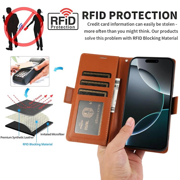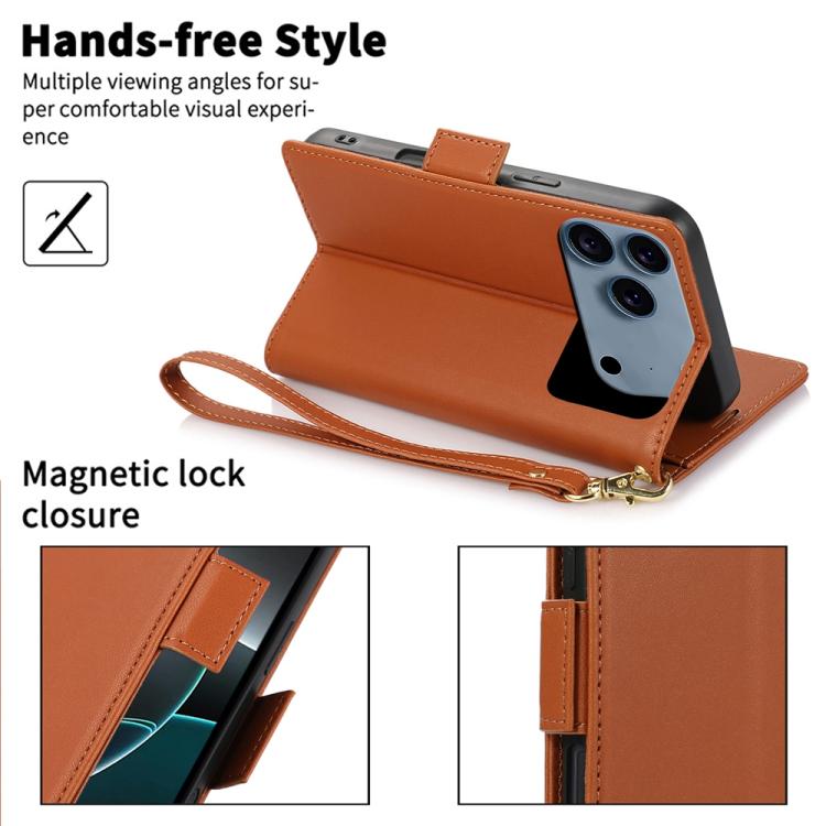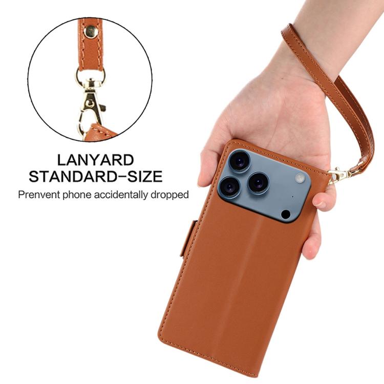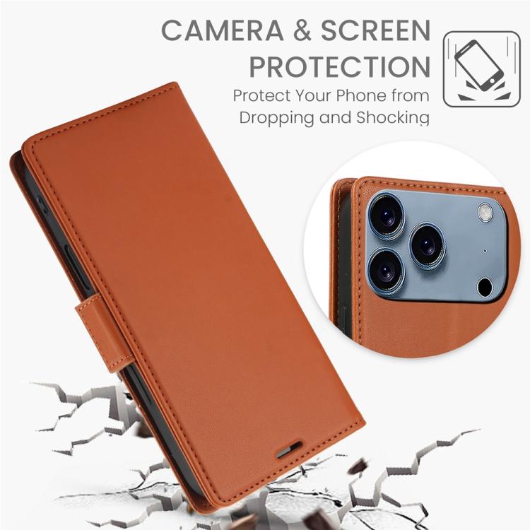 Funda de cuero antirrobo RFID con hebilla lateral para iPhone 17 Pro (marrón)