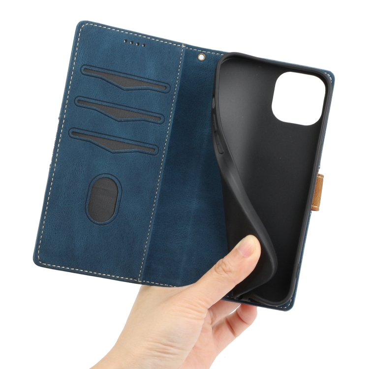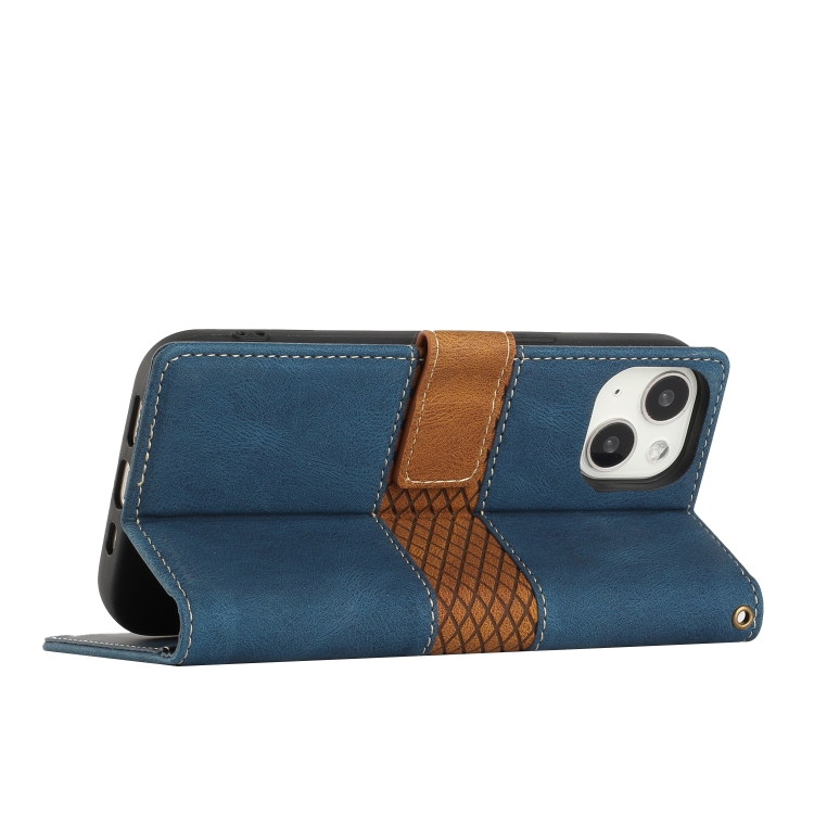 Funda de Cuero para iPhone 13 Mini con Costuras de Cuadrícula y Cordón (Azul)