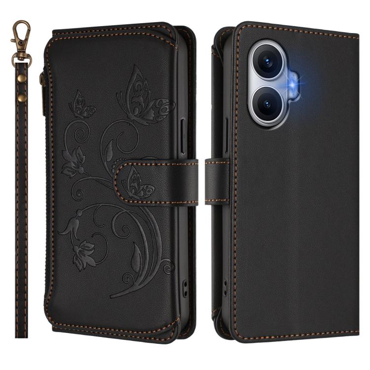 Funda de cuero con cremallera para Redmi Turbo 4 Pro y Xiaomi Poco F7, diseño de mariposas, flores y múltiples tarjetas (negro)