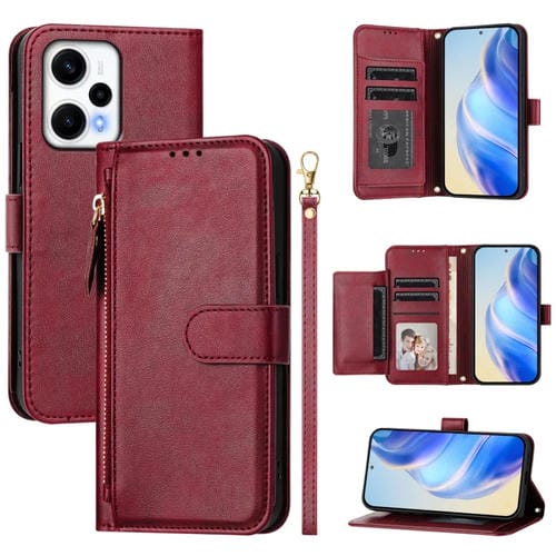Funda de Cuero con Cremallera para Teléfono Xiaomi Poco F5 / Redmi Note 12 Turbo 5G con Ranuras para Múltiples Tarjetas (Rojo Oscuro)